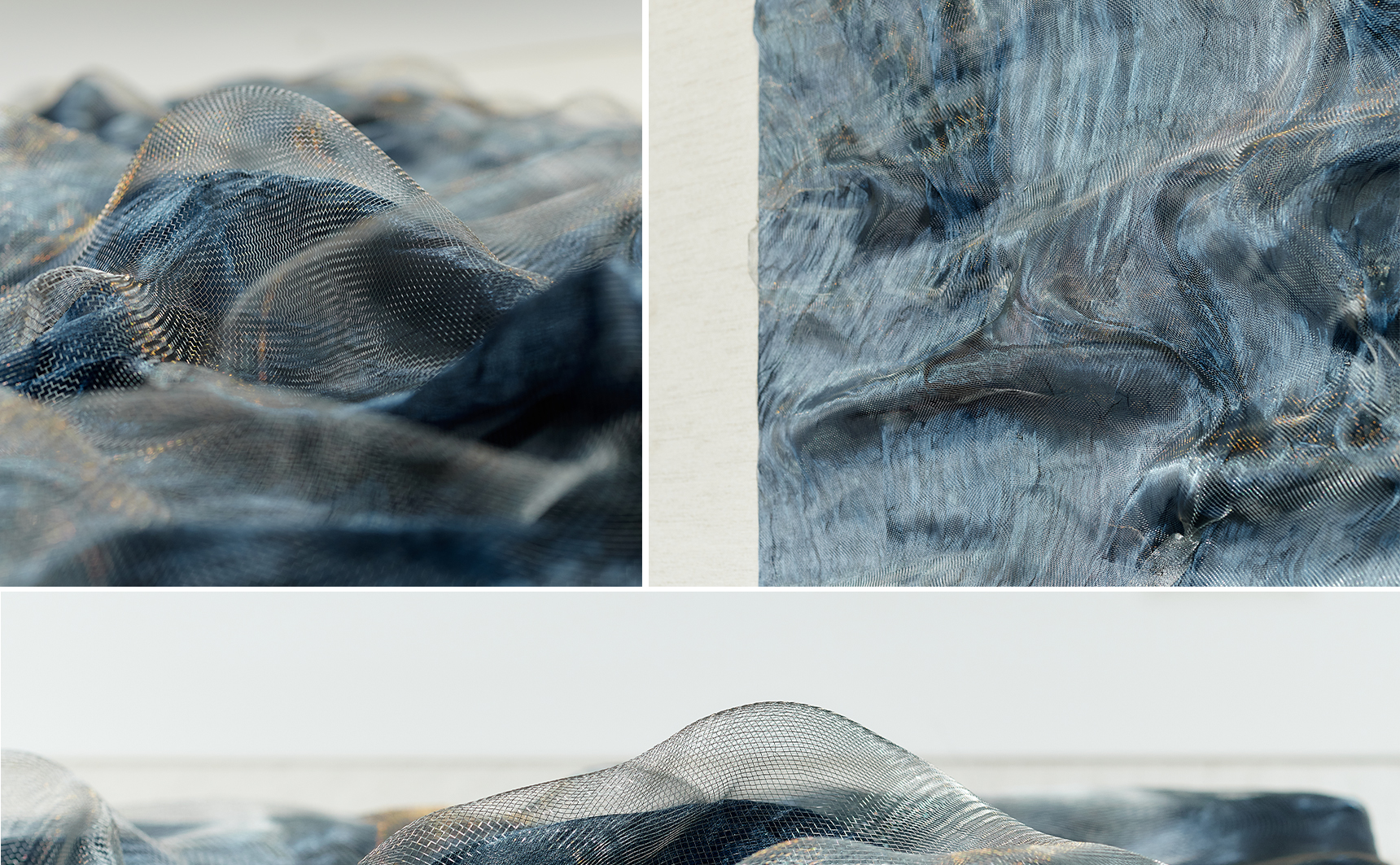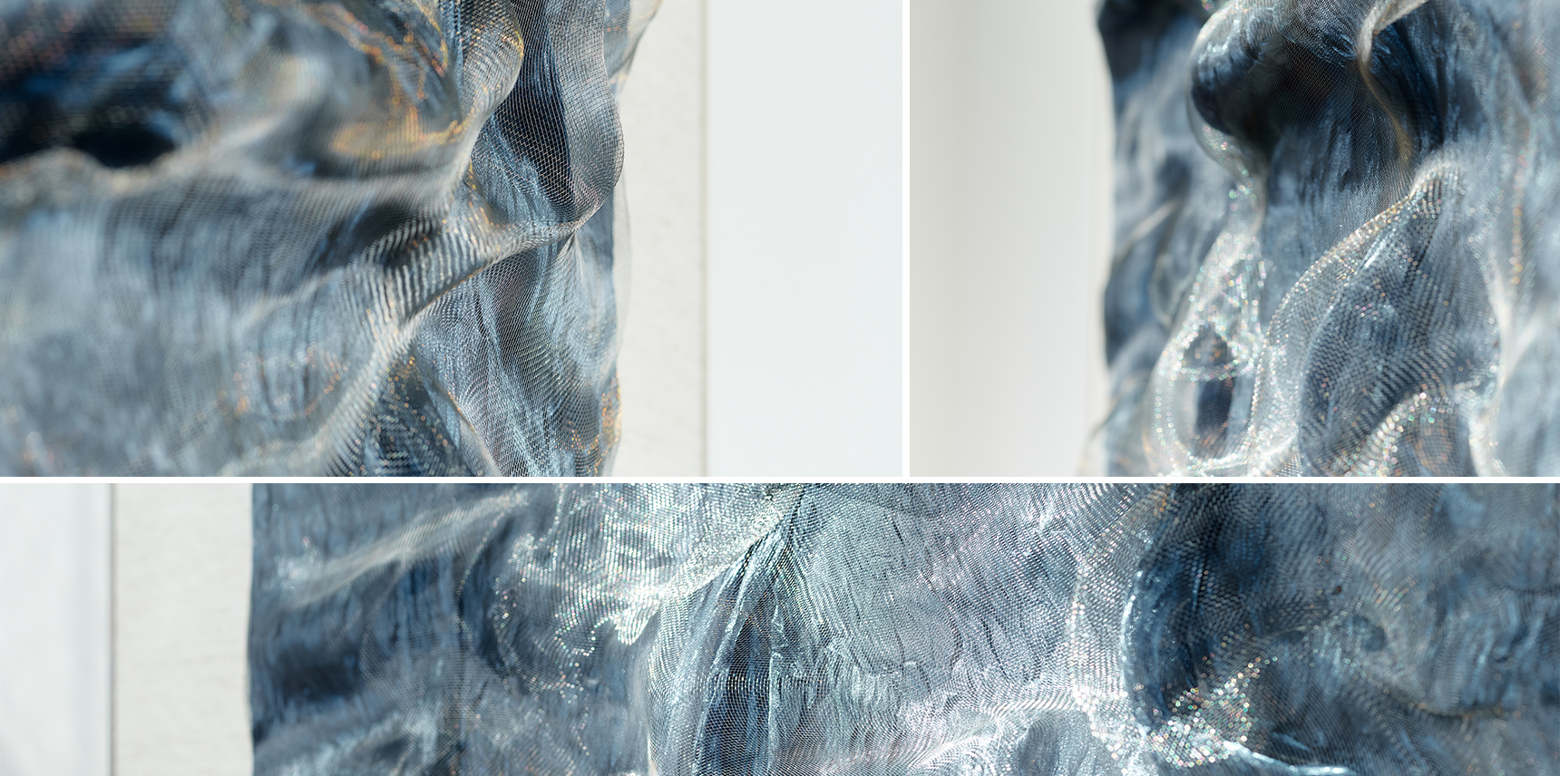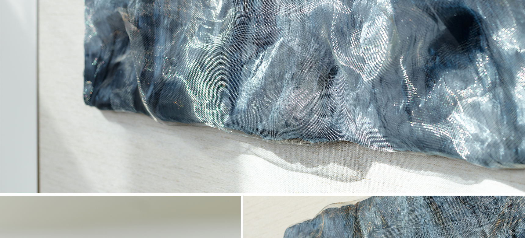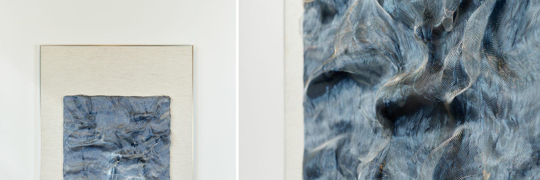 This fiber artwork captures the rhythm of water and light through its folds and textures. The layered blue surface feels both light and profound, as if shaped by wind and time, evoking serenity and resilience. Beyond its material form, it becomes an abstract reflection of nature, life, and the passage of time, infusing spaces with poetic depth and contemplative calm.
